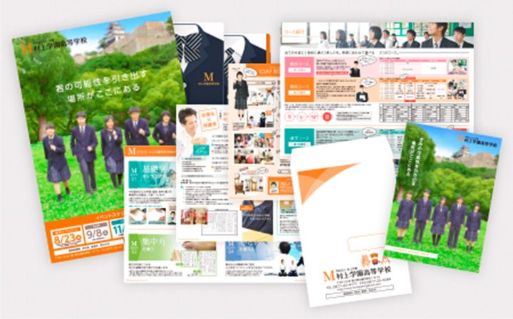 TV・新聞・雑誌(進学誌、情報誌)・WEB・モバイル(SNS)・屋外広告・動画製作・ 学校案内パンフレット・チラシ・ポスター・リーフレット・ダイレクトメール(DM)・封筒など、生徒募集の為の販促ツール etc.